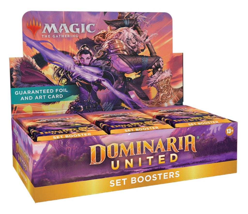 The Dominaria United Set Booster Box contains 30 Dominaria United Set Boosters and 1 Traditional Foil Box Topper card.