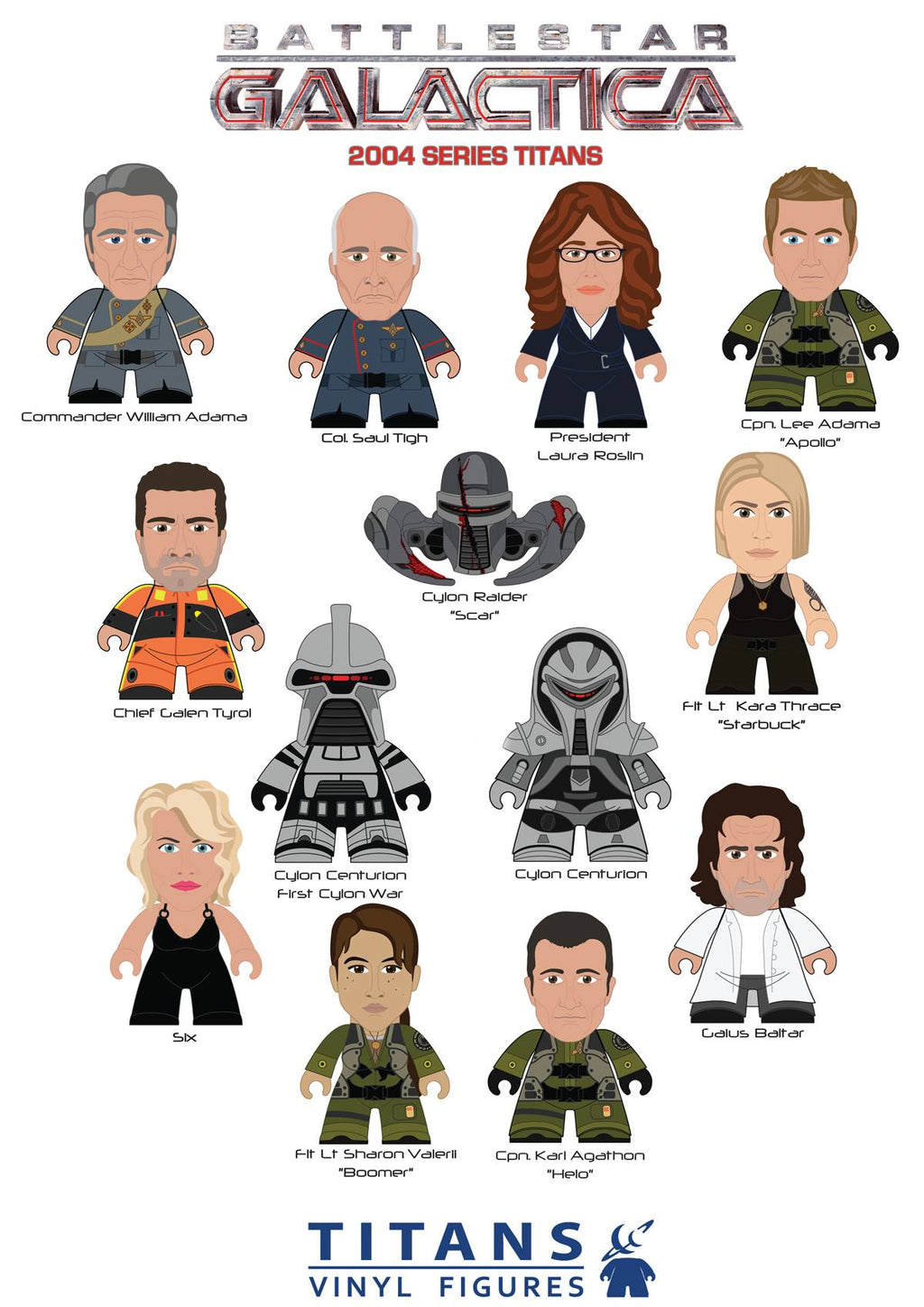 From Titan Entertainment! NBC Universal and Titan Entertainment celebrate Ronald D. Moore's inspired re-imagining of Battlestar Galactica with this debut range of 2004 Series TITANS! This 13 piece set celebrates Battlestar Galactica's epic struggle for survival as humankind flees from the merciless Cylons and struggles to find a new home in the depths of space. The set includes all of the show's most popular characters: the brilliant-but-narcissistic-and-self-preserving Dr. Gaius Baltar, ever-evolving Viper pilot Kara "Starbuck" Thrace, President of the Colonies Laura Roslin, and legendary military leader William Adama. Also included is a deadly Cylon Centurion and the infamous Cylon Raider "Scar." Each figure is 3" blind-boxed and some come with a character specific accessory. Plus, 4 hidden chase figures for you to hunt and collect! Blind mystery box packaging.