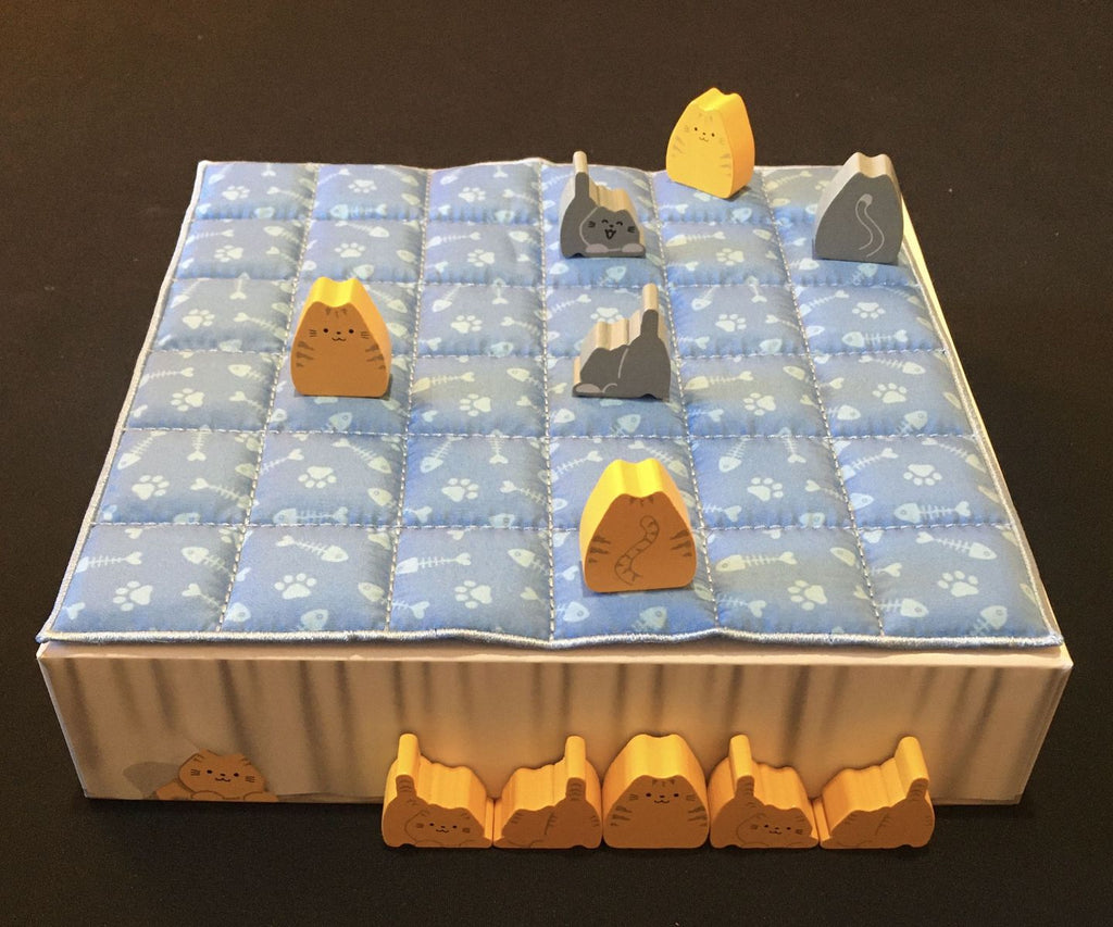 Every time you place a kitten on the bed, it goes "boop."Which is to say that it pushes every other kitten on the board one space away. Line up three kittens in a row to graduate them into cats...
