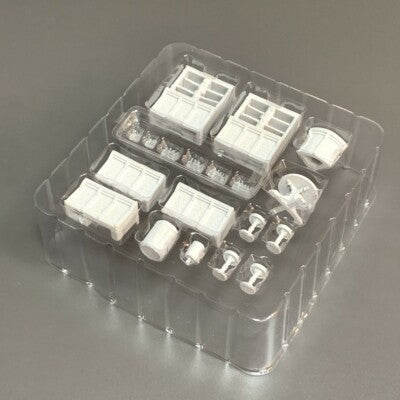 Contains: 6 sets of bottles (cast in clear plastic), 2 shelf sections, 3 countertop sections, 1 countertop corner section, 1 small keg, 1 barrel, 1 table, 4 stool