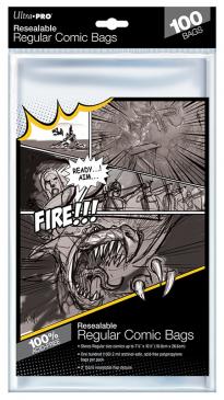 Ultra clear, archival-safe comic bags designed to fit Regular size comics up to 7-1/8" x 10-1/2" in dimension. 100 per pack, acid-free and no PVC. Resealable flap provides extra protection and easy removal.