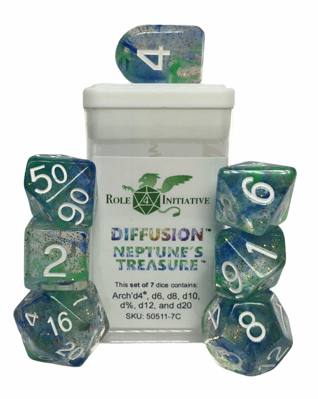 This set of 7 dice in Diffusion Neptune's Treasure includes Arch'd4,d6, d8, d10, d%, d12, and Balance'd20. Role 4 Initiative dice average about 25% larger than traditional dice and come in a plastic display box. The Arch'd4 is a uniquely shaped die that features large top-face numbers and is easier to read, pick up, and roll. The Balance'd20 has a unique arrangement of numbers so that any 5 adjacent sides add to either 52 or 53 to ensure the most even distribution of outcomes.
