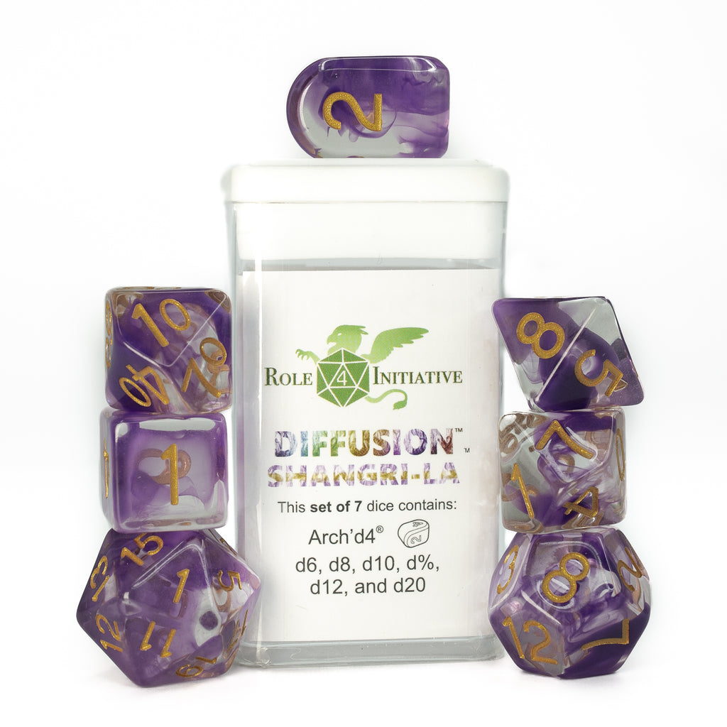 This set of 7 dice in Diffusion Shangri-La includes Arch'd4,d6, d8, d10, d%, d12, and Balance'd20. Role 4 Initiative dice average about 25% larger than traditional dice and come in a plastic display box. The Arch'd4 is a uniquely shaped die that features large top-face numbers and is easier to read, pick up, and roll. The Balance'd20 has a unique arrangement of numbers so that any 5 adjacent sides add to either 52 or 53 to ensure the most even distribution of outcomes.