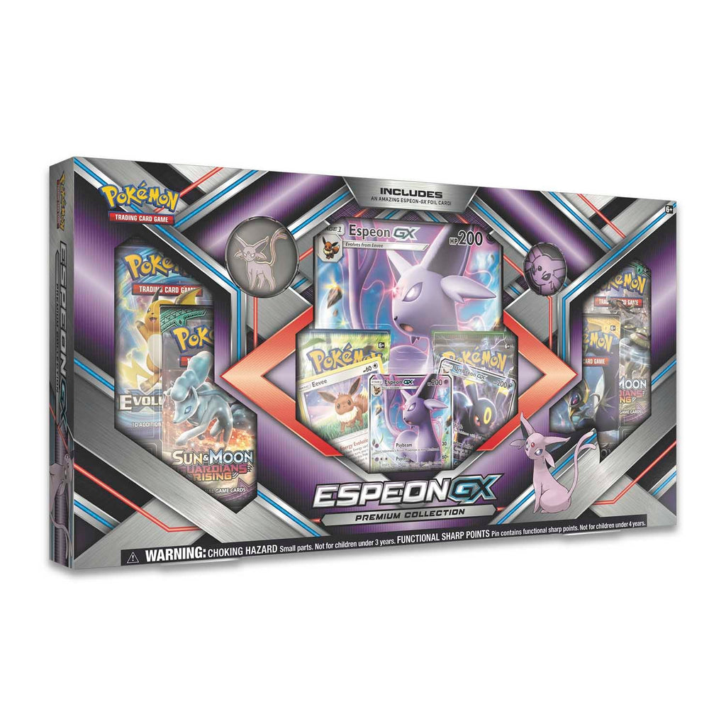 The Sun Pokémon Espeon is a loyal friend for any Trainer—and Espeon-GX brings the powerful Psybeam and Divide-GX attacks to your game! This collection brings you Espeon-GX as a foil promo and oversize card, pin, and coin, along with foil cards featuring Eevee and Umbreon-GX. Light a path to victory with the power of Espeon-GX!