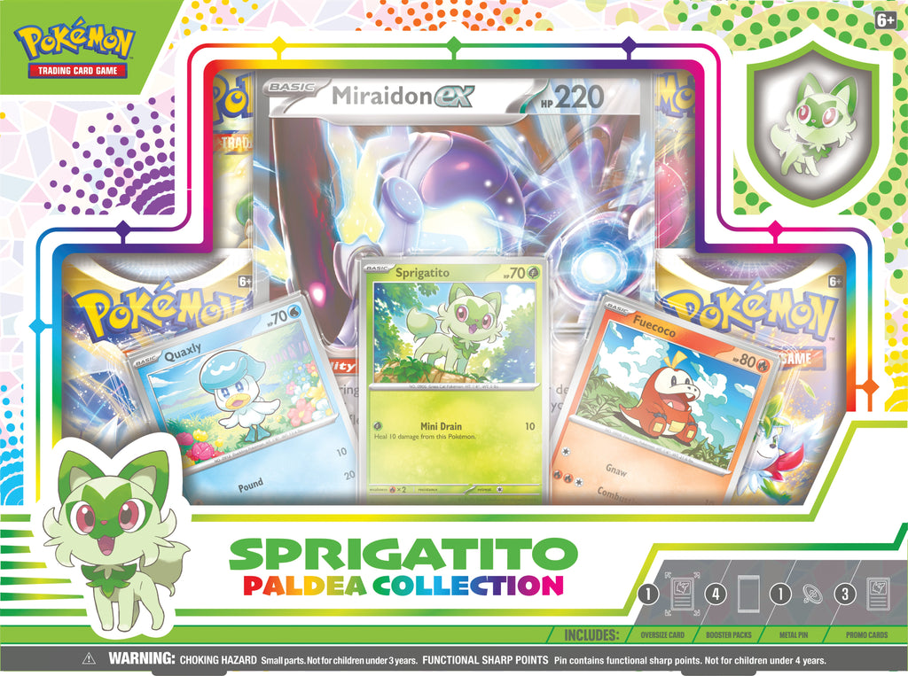 First partner Pokémon Sprigatito, Fuecoco, and Quaxly join your collection as foil promo cards, and an enamel pin lets you show off your chosen Pokémon everywhere you go. Discover even more with booster packs and an oversize card featuring the Legendary Pokémon Koraidon or Miraidon as a powerful Pokémon ex!
